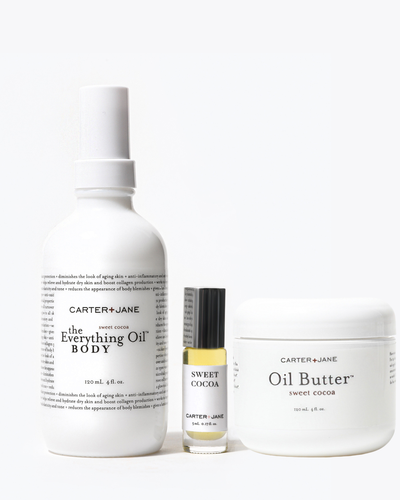 The Everything Oil™ Sweet Cocoa is a revolutionary skin care product that replaces the need to use face and body moisturizers, serums, cellulite creams, and even fragrance. You can also use it as a hair oil to add a glossy shine! Our proprietary formula uses a combination of organic oils known for their amazing antioxidant properties, as well as a beautiful mix of essential oils.